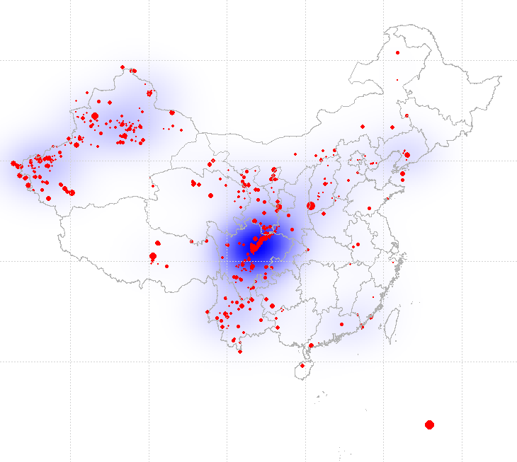 蓝色的背景是地震点的密度——也许是喜马拉雅造山运动,也许是三峡工程,不管怎样,四川地区不太平啊!弟兄们小心!