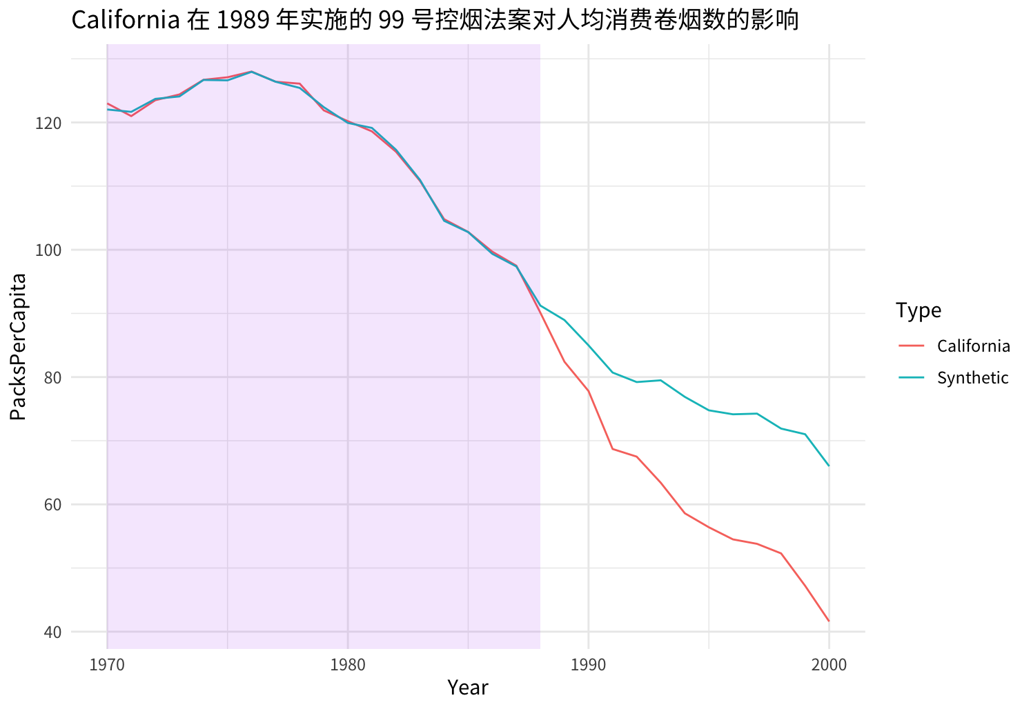 根据以上构建的合成双重差分法得到的分析结果看,加州实施的烟草控制计划的影响就非常显然了。在第 99 号提案之后: