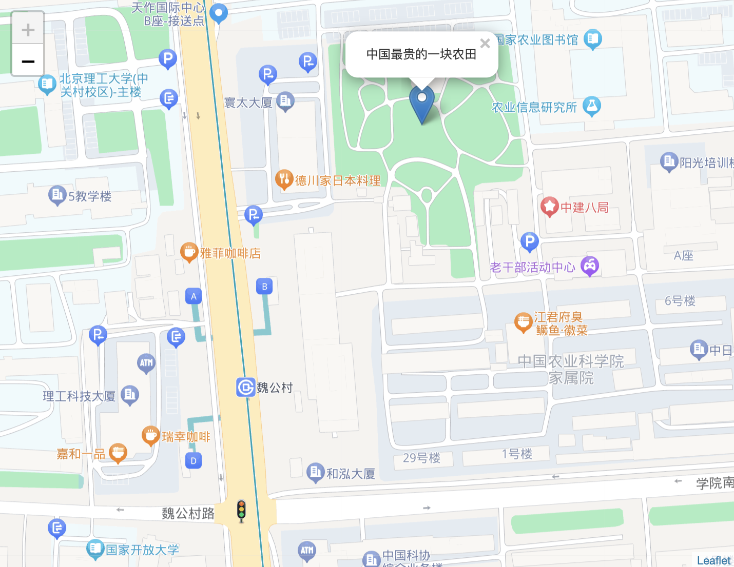 addMarkers(lng=116.331415, lat=39.965217, popup="中国最贵的一块农田")
