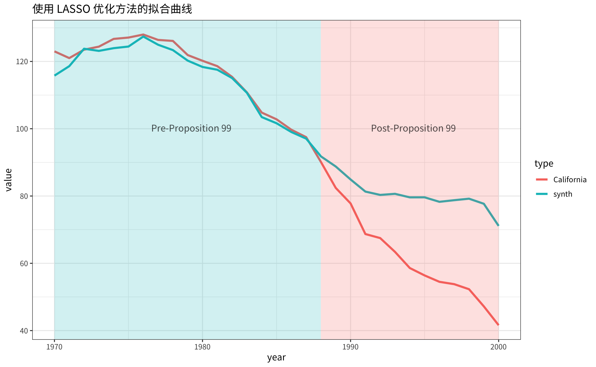 实际和合成控制组有这样的比较效果: